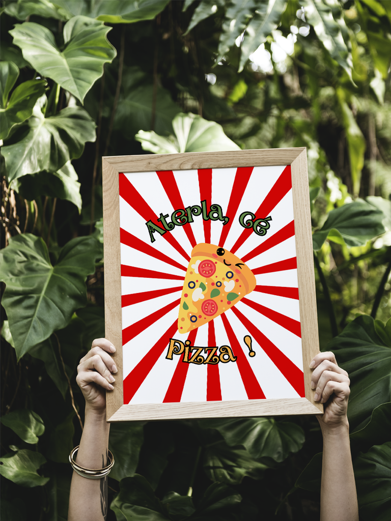 L’affiche "Aterla cé pizza !" allie une illustration d’une pizza à une touche locale réunionnaise subtile dans son texte.