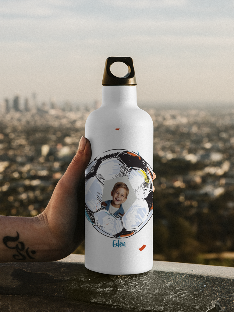 Pour tous les petits fans du ballon rond, voici la gourde personnalisée Football ! À l'école, au sport ou en sortie, elle suivra votre enfant partout avec son prénom et sa photo imprimés dans un univers 100 % foot.