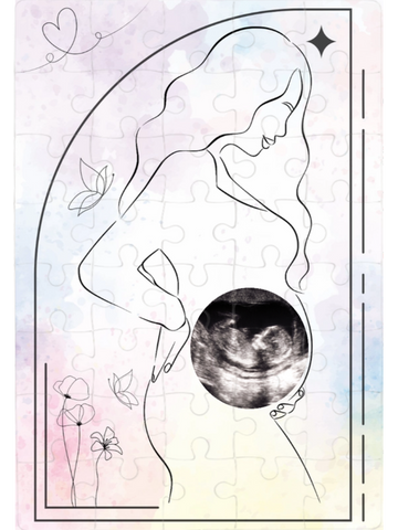 Un joli puzzle de 40 pièces avec un visuel préfabriqué, spécialement conçu pour intégrer la photo de votre échographie.